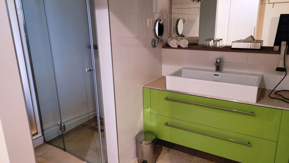 Az elegáns, wc-től külön levő fürdőszobában minden megtalálható, ami az igényes vendégek elvárnak, a kiegészítők előírásszerűen megvannak, a minőség mindenben a 4 csillag feletti.