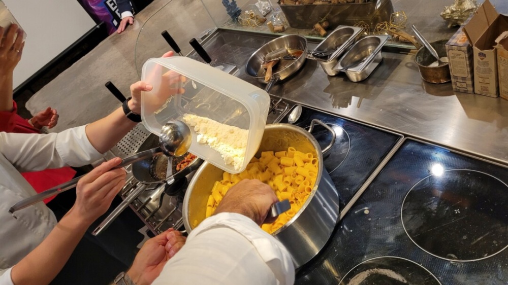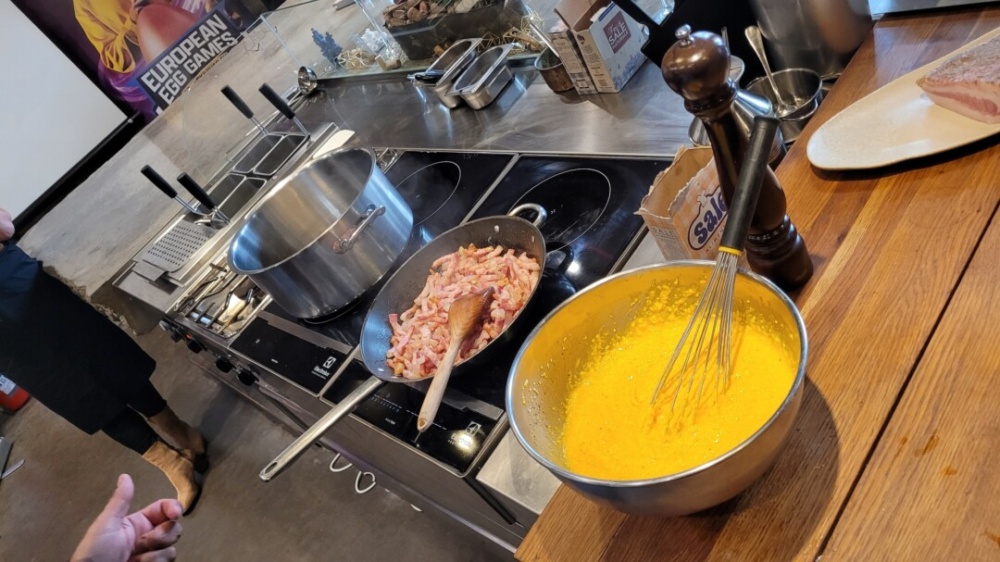 Gianni nem csak egyszerűen megfőzte a Carbonarat, hanem érdekes történetekkel is szórakoztatatta a vendégeket, és pontosan elmondta minden alapanyagnak, és magának a Carbonara tésztának is a történetét, ami igen érdekes volt, és sokban elért attól, amit gondoltunk, vagy korábban hallottunk.