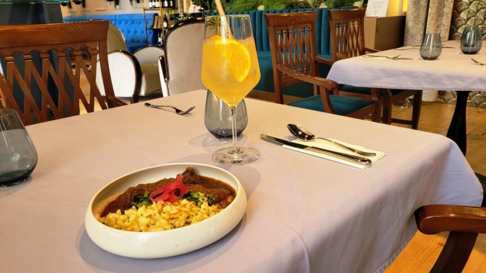 Viszont nem volt alkalmunk ezen sem elmélkedni, mert megérkezett a „kis adag” „Vörösboros marhapörkölt, méghozzá vajas-petrezselymes nokedlivel”. Hát ez annyira finom volt, hogy bizony ezt tutira választanánk tényleges kínálatba is, ha nem kóstolósort rendeltünk volna, és ha már nem lettük volna igazából jóllakva ennyitől is…
