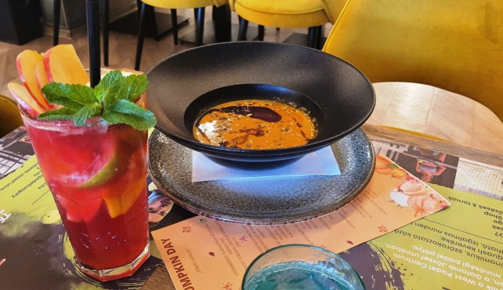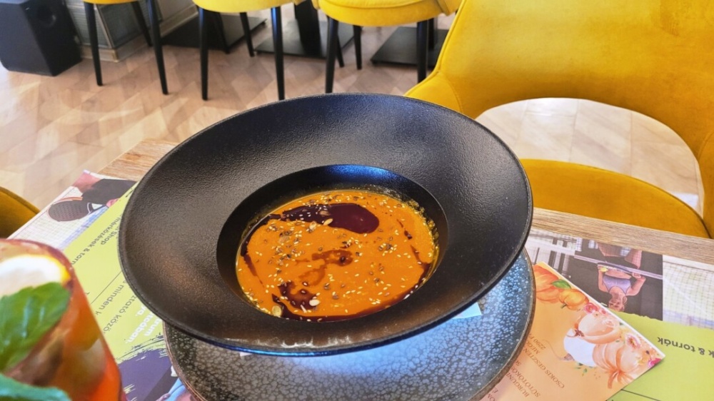 Egyértelmű, hogy a levesünk egy „Gyömbéres-narancsos sütőtök krémleves volt, pirított tökmaggal, Őrségi tökmagolajjal”… A kép is sokat elárul, az ízharmónia fantasztikus, az elkészítés mesteri, ahogy a tálalás is, meg kell kóstolni, aki betér!