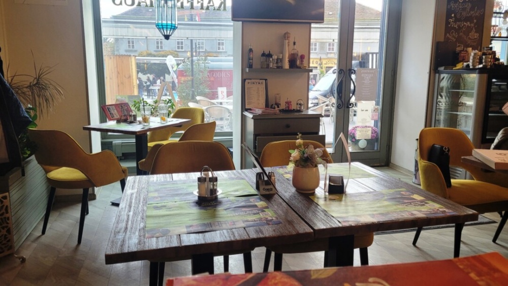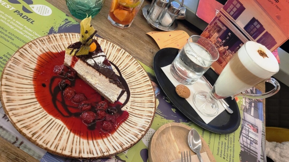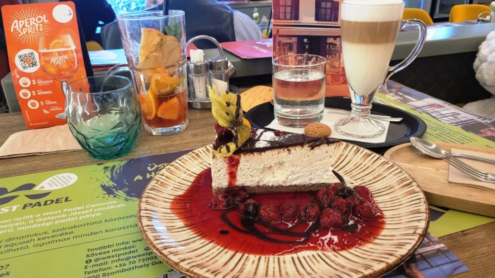 Bár a hasunk tele volt, de desszert nélkül nem ebéd az ebéd, így hát az idény ajánlatból választottunk egy fenséges „Csokis gesztenye tortát, forró meggyel”. A összhatás fantasztikus volt, dicséret a kitalálójának és a késztőnek, már csak ezért is érdemes betérni, ha enni nem szeretnénk, egy jó kávéval tökéletes pihenés a városnézés közben.
