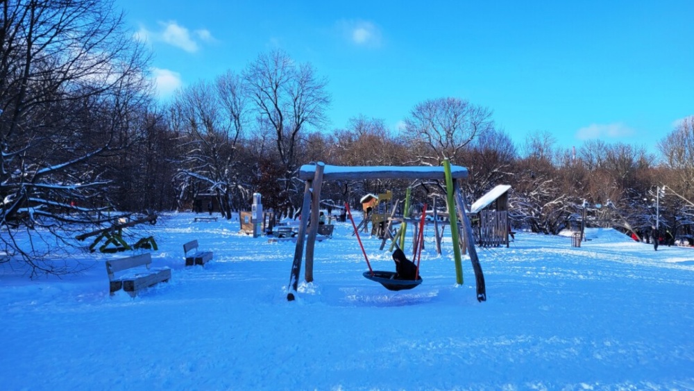 Ha kicsit távolabb megyünk, akkor még egy komplett, télen is használható játszótér is rátesz erre egy lapáttal. Itt már hóágyuk is segítenének, ha nem lenne elegendő hó.
