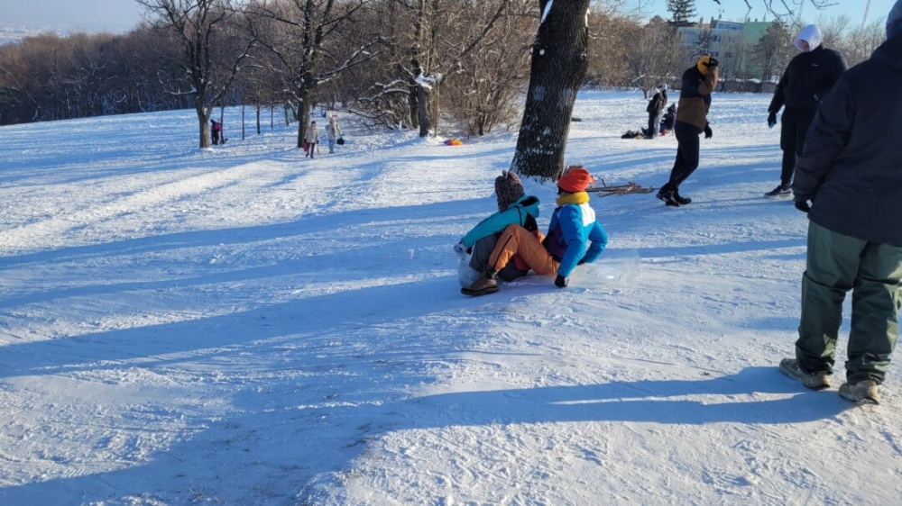Persze ha gyerekkel érkezünk, kötelező valamilyen csúszáshoz való eszközt magunkkal hozni, mivel nehéz megállni, a több részen is erre alkalmas rétek lehetőségeit kihasználását. Nos, itt aztán az „eszköz” fogalma a nejlon zsáktól a spéci szánkókig ezernyi tárgyban ölt képet…