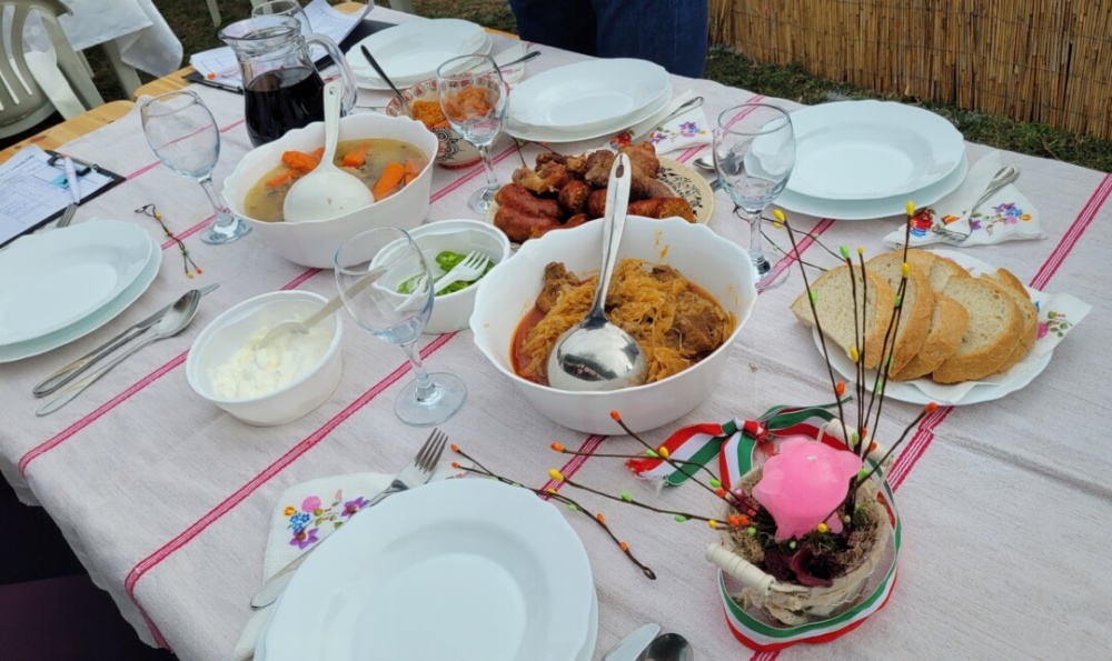 Ebédre a hurka, kolbász, pecsenye mellé elkészültek a tájjellegű ételek is, volt köztük pörkölt, káposzta, Orja leves, gulyásleves, kinek mire volt gusztusa. Egyértelműen minden kint készült a friss disznókból, nagyszülők receptjei alapján!