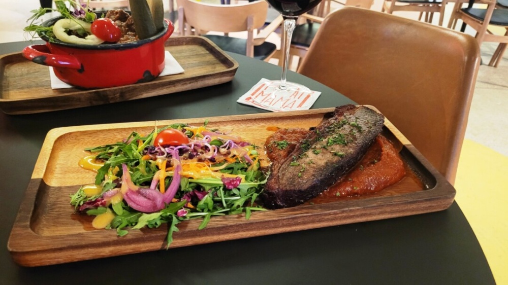 Van lehetőség reggelire, a környékből adódóan egyértelműen Brunch-re is, de 13 óra után azért már a „rendes” étlap dukál. Ami több mint korrekt, nem regény, amit nem győzünk végiglapozni, viszont éppen elég ahhoz, hogy elhiggyük, frissen tartják készleten az alapanyagokat, és tényleg mindenki találjon magának megfelelő fogást.