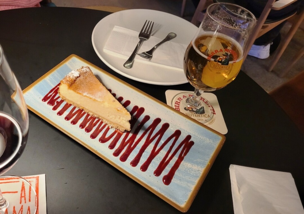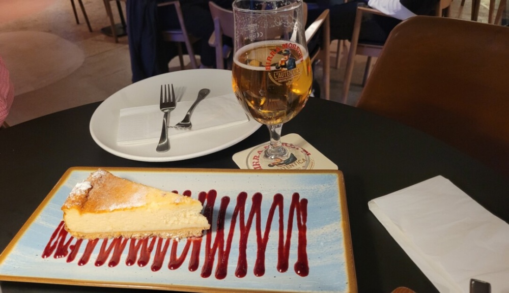 Itt most már valóban csak egy helyben készült finomságot kértünk, ami egy óriási szelet, friss sajttorta volt, eper öntettel, ami nem csak különleges dísze volt a tálalásnak, hanem nagyon finom is, remekül passzolva a sütihez.