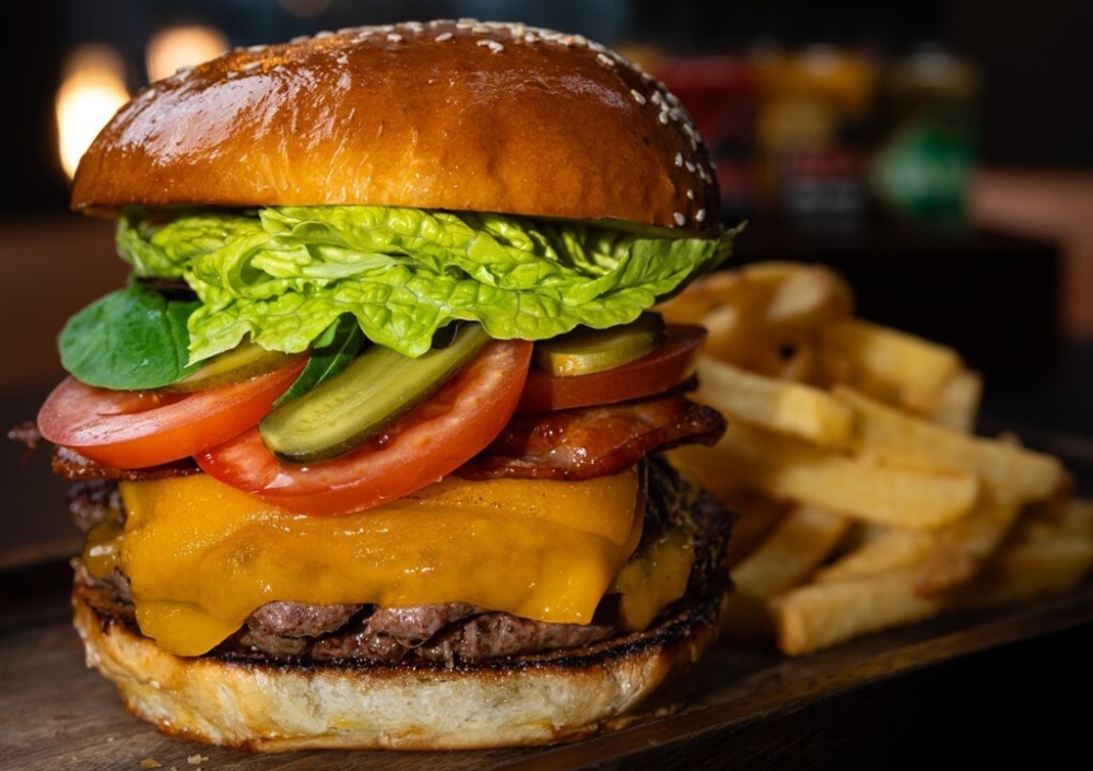 Elhelyezkedéséből, és részben vendégkörének jó részéből adódóan a burgerek kihagyhatatlan kínálatot képeznek, láttuk másik asztalnál, egy fotó erejéig, hát tényleg éhes fiatalnak kell lenni, aki ezt elpusztítja!