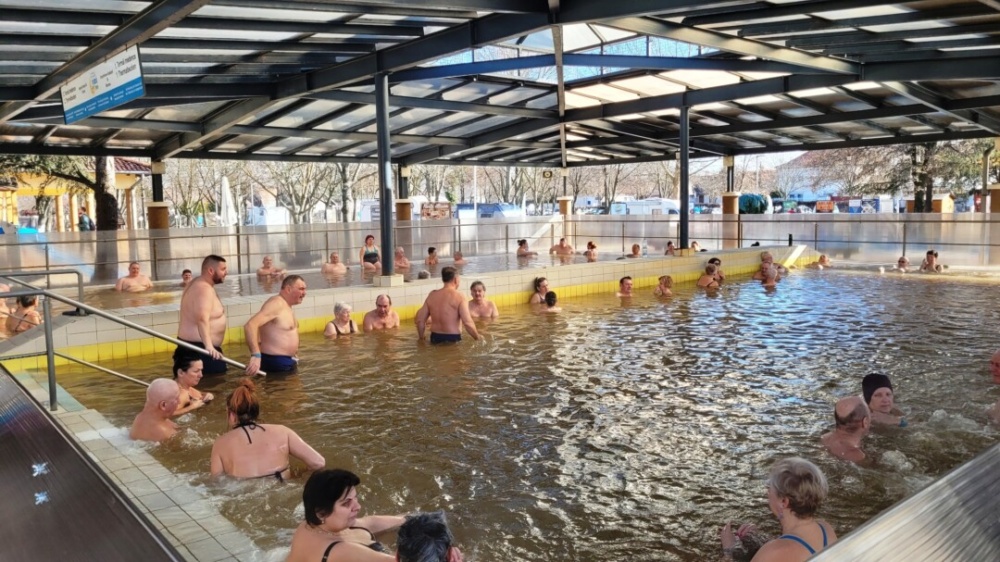 Külön előnye, hogy felülről fedett, oldalról plexivel le van zárva a hideg szél elől, de közte a pára és az erőteljes termálvíz gőz szabadon tud távozni, nincs a sok zárt helyen fullasztó gyógyvízszagú gőz, és amikor kisüt a napocska, a tető alatt kellemesen napfürdőzhetünk is „áztatás” közben.