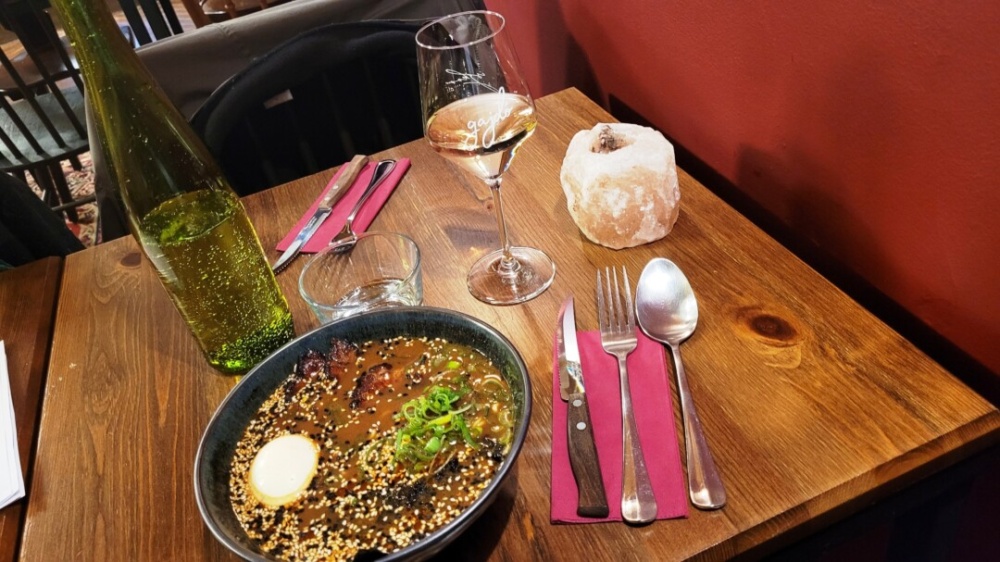 Az étlap még épen elegendő, változatos, specialitásuk a „Miso ramen”, Japán ihletésű, jellegzetes, kicsit csípős leves, japán tésztával, sült sertés császárral, szójás tojással, szemmaggal. Igazi innyencség, amire remekül csúszik egy helyi száraz fehér bor.