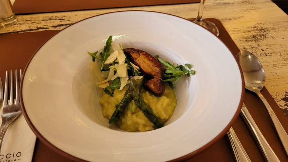 Kiváló egyesítése a kicsit magyaros ízvilágnak az olasz ízekhez a következő fogás, mely egy zöldspárga rizottó volt, csodálatosan elkészített friss kacsamájjal. Egy igazi kulináris orgia volt a szánkban, kihagyhatatlan fogás, aki különlegességre vágyik.