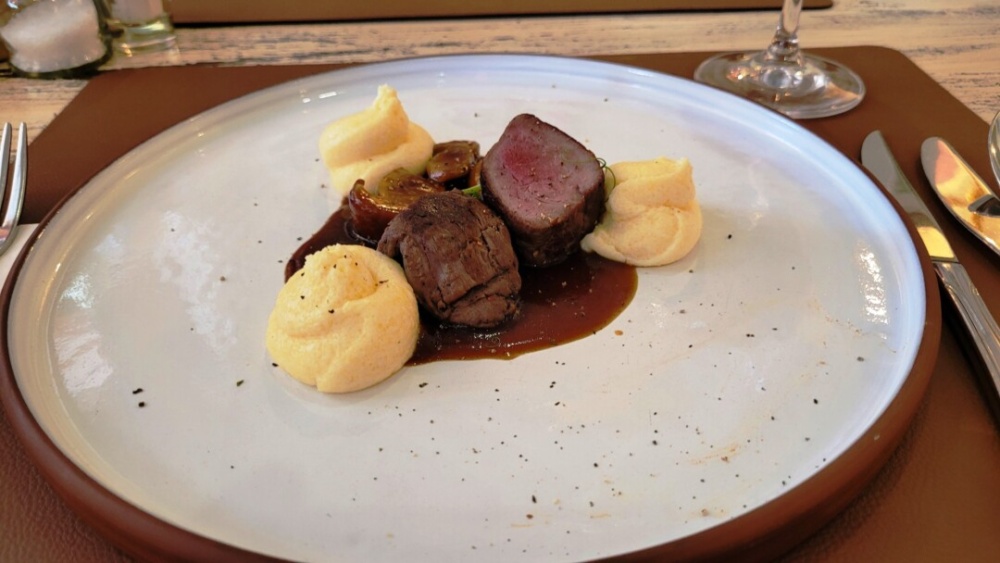 Viszont hogy azért egy kicsit a magyaros vonal irányába is jobban elhajoljunk, hiszen mégis csak Alsóőrsön vagyunk, az utolsó főétel kóstolásunk egy vörösboros vaddisznó bélszín volt, méghozzá igazi különleges, máshol nem így elkészített friss kecskesajtos polentával, és egy fenséges vargánya jus-al… Ezt már meg sem kísérelem leírni, egyszerűn kötelező megkóstolni!