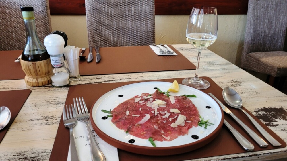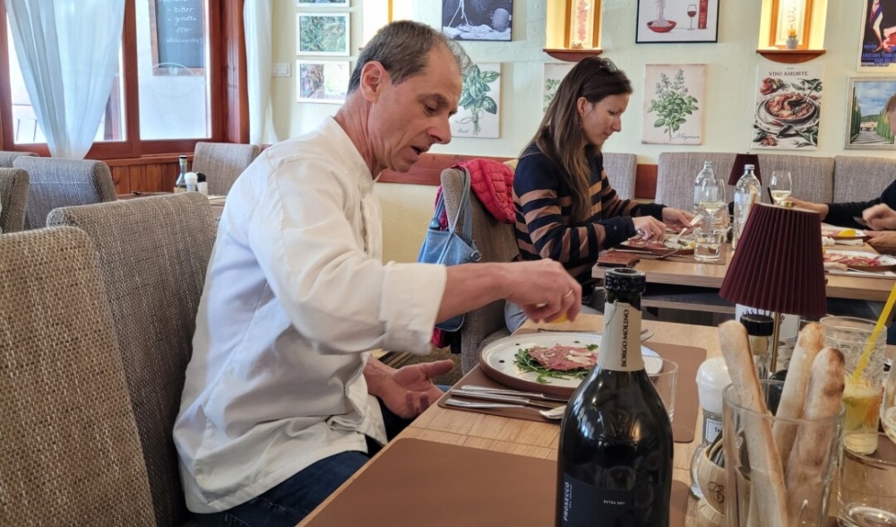 Mivel is kápráztatott volna el minket „bevezetésként” a híres séf, mint egy bélszín Carpaccio-val, ami rukkolával és Grama Padaloval, és házi Grissinivel volt találva. Még most is a számban érzem a pompás ízeket. Ehhez még remekül passzolt a csodás prosecco-nk.
