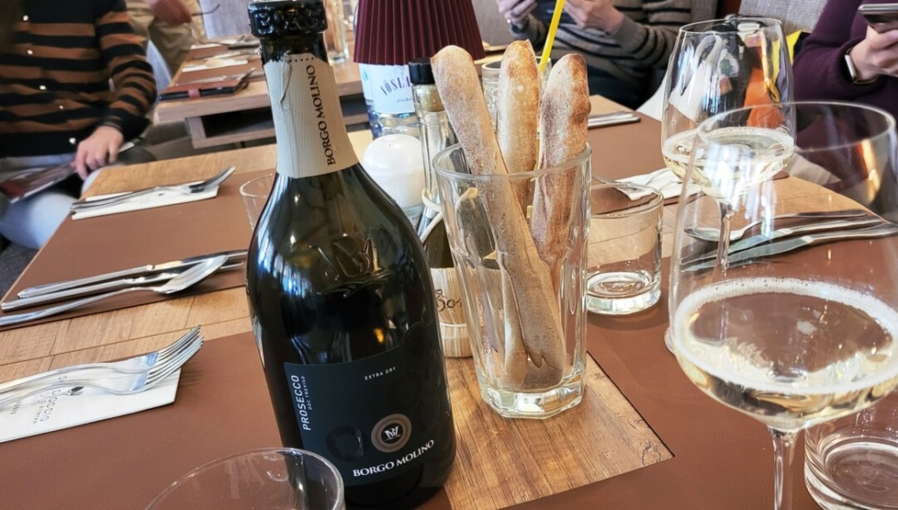 De vágjunk is bele, hiszen már utólag is csorog a nyálunk, ha visszagondolunk a sok finomságra! Egyértelmű, hogy olaszos vendéglő lévén aperitifként egy igazi olasz, extra dry prosecco-t kértünk, mely egy Borgo Molino példány volt. Nos, itt kezdődik a prosecco….